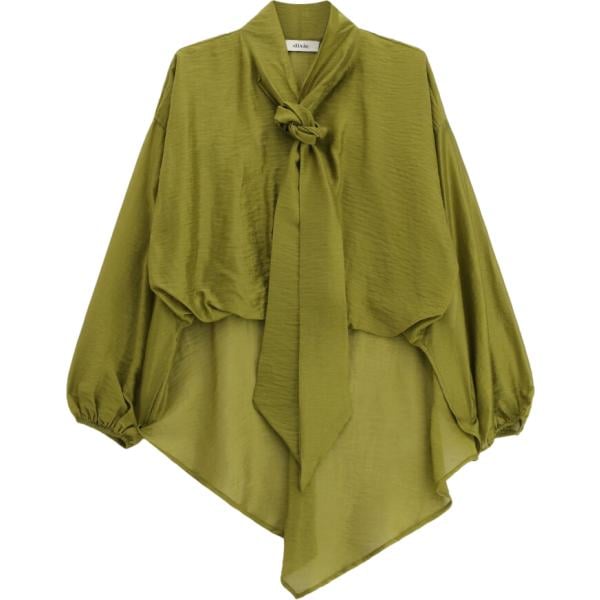 Camicia da donna forma asimmetrica in verde oliva con fiocco a maniche lunghe