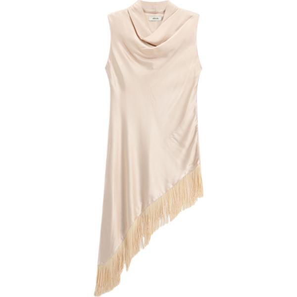 Top da donna forma asimmetrica in beige sabbia con frange con scollo lungo senza maniche