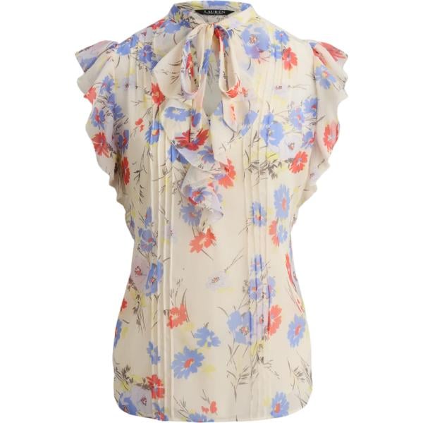 Blusa da donna in bianco avorio a fiori con ruches collo a v