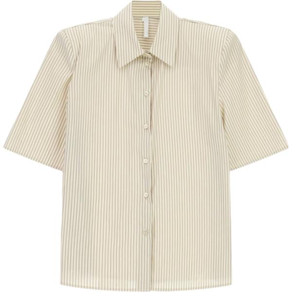 Camicia a maniche corte da donna in bianco avorio a righe collo classico a maniche corte