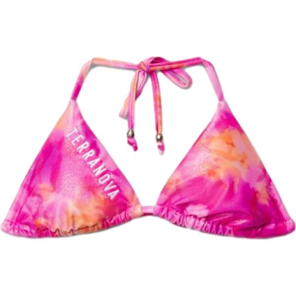 Reggiseno bikini da donna a triangolo tinta unita con scritta sul davanti, ideale per mare e piscina. I laccetti regolabili da annodare dietro al collo e sulla schiena permettono una vestibilità personalizzata e valorizzano il décolleté. Perfetto da abbinare a slip coordinati o mix and match e a un pareo per un look da spiaggia curato.