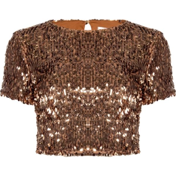 Pantaloni wide leg in tessuto operato sabbia, taglio sartoriale con piega stirata e tasche alla francese. Camicia in georgette panna con rouches allo scollo a V e volant a fondo maniche lunghe. Giacca destrutturata in raso di viscosa stretch testa di moro, apertura frontale con colletto a revers, maniche lunghezza tre quarti. Décolleté slingback in pelle metallizzata bronzo/oro, punta stretta, tacco kitten. Accessori e gioielli in tono.