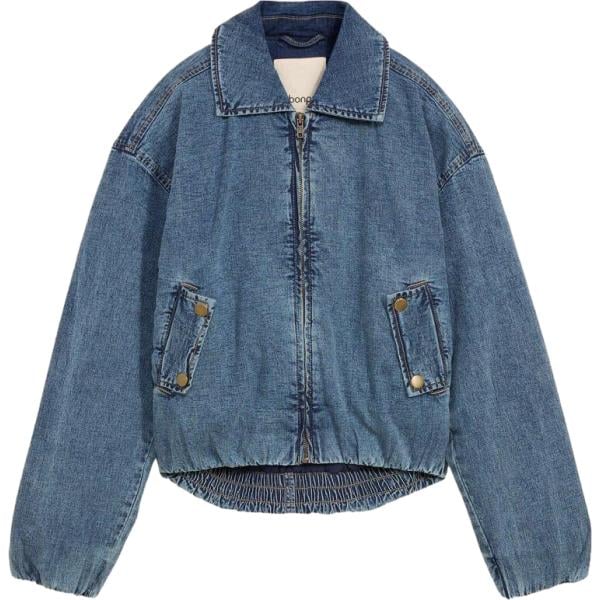 Zaino da donna in azzurro con zip Michael Michael Kors, Jeans da donna in blu scuro con frange a vita alta in denim Please, Bomber da donna in azzurro corto con zip Imperial, Mocassini da donna in marrone scuro Dixie, Top da donna in giallo scuro a fiori con pizzo a maniche lunghe Dixie.