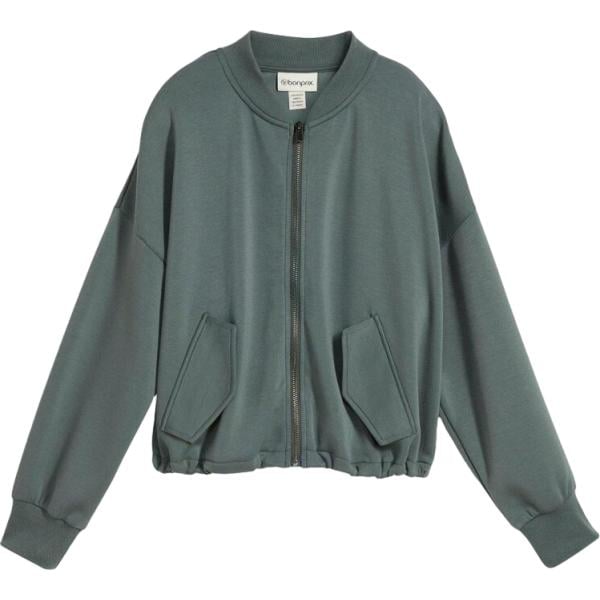 Bomber da donna in blu scuro corto a maniche lunghe bonprix, T-shirt da donna boxy in blu scuro bonprix, Sneakers alte da donna in grigio chiaro con plateau bonprix, Shopping bag da donna in blu scuro Freddy, Jeans da donna in blu medio con zip in denim Terranova.
