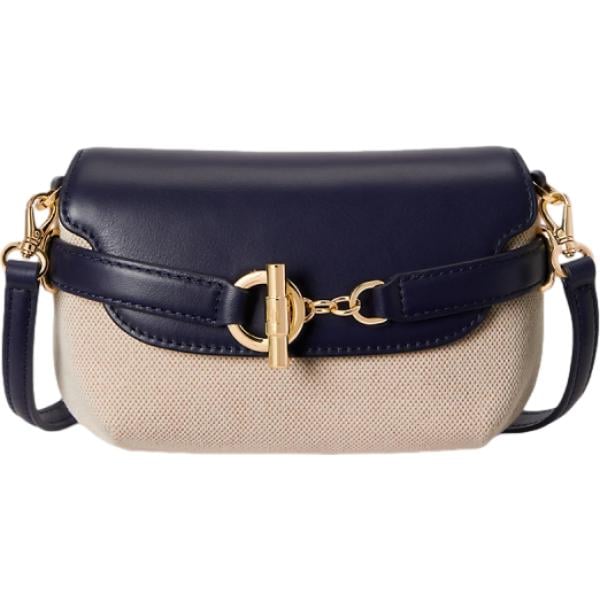 Borsa a tracolla da donna in blu scuro a righe con zip Bonprix, Stivaletti da donna in marrone chiaro Terranova, Maglione da donna in blu scuro effetto strappato girocollo a maniche lunghe in cotone Terranova, Camicia da donna in azzurro a righe collo classico a maniche lunghe con bottoni in viscosa Terranova, Pantaloni a palazzo da donna in bianco avorio con coulisse Please, Foulard da donna in bianco avorio con stampe Imperial.
