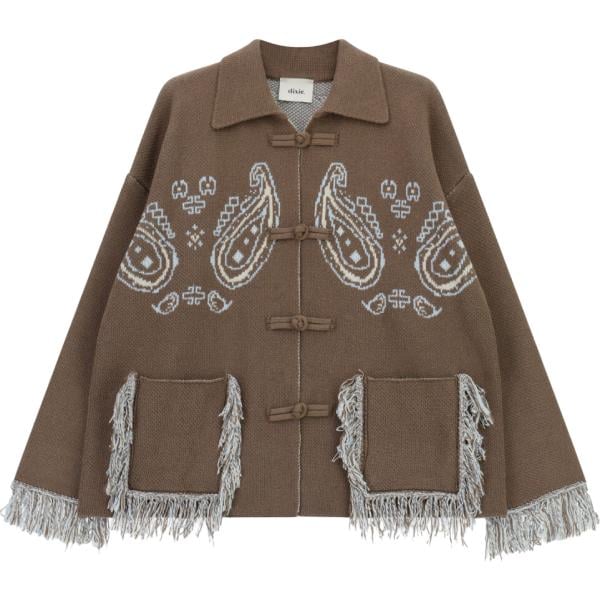 Cardigan da donna in marrone scuro con stampe con frange