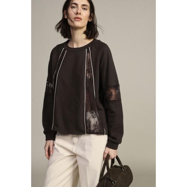 Felpa da donna in marrone scuro con pizzo girocollo