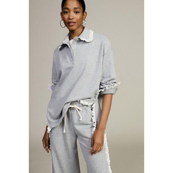 Felpa da donna in grigio scuro con ruches collo a polo