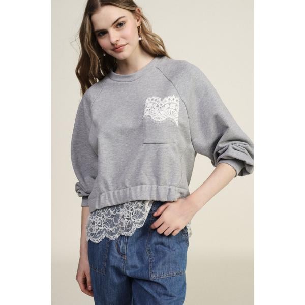 Felpa da donna in grigio scuro con pizzo girocollo corto a maniche lunghe