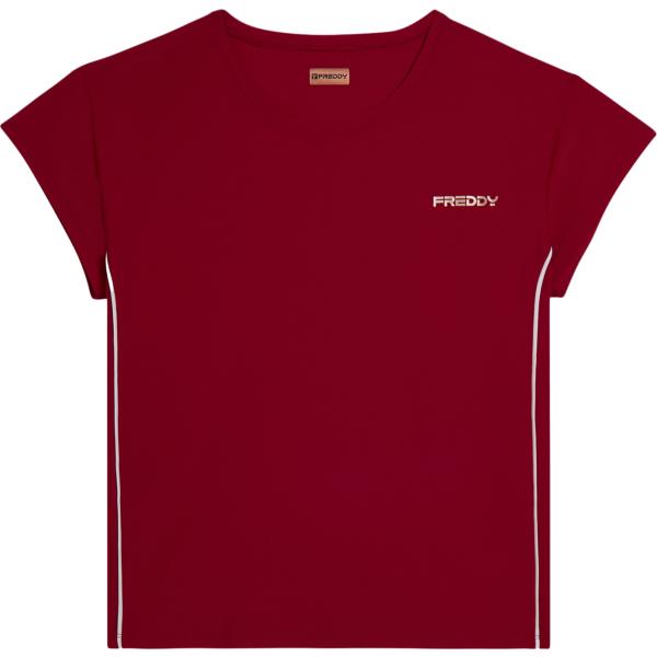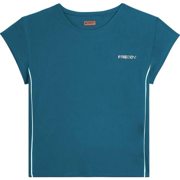 T-shirt sportiva da donna in verde scuro con stampe con scollo con spacco