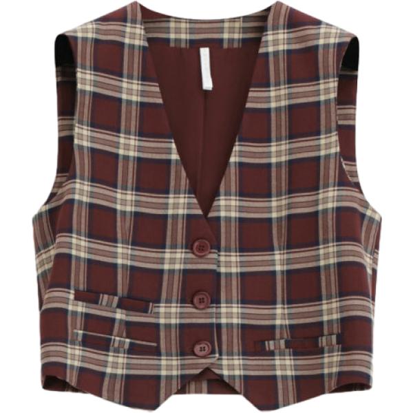 Gilet da donna in marrone scuro a quadri corto con bottoni