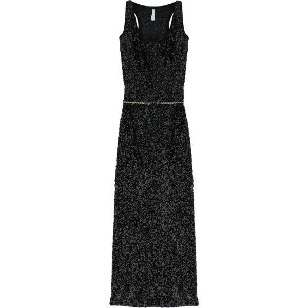 Vestito lungo da donna in nero pece con paillettes con spalline lungo con cintura