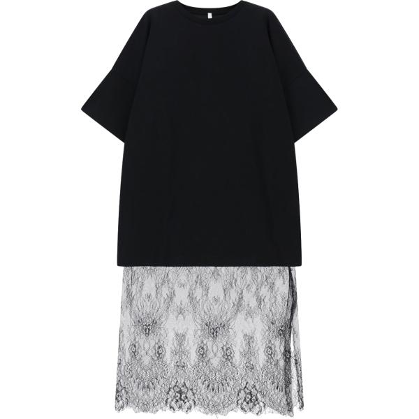 Vestito longuette/midi da donna in nero pece con pizzo a maniche corte