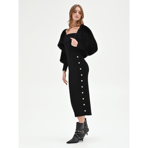Vestito longuette/midi da donna in nero pece lavorato a maglia con scollo con spacco a maniche lunghe con bottoni