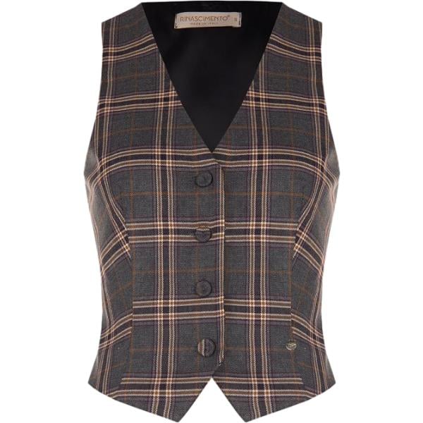 Gilet da donna in grigio scuro a quadri collo a v monopetto con bottoni in denim