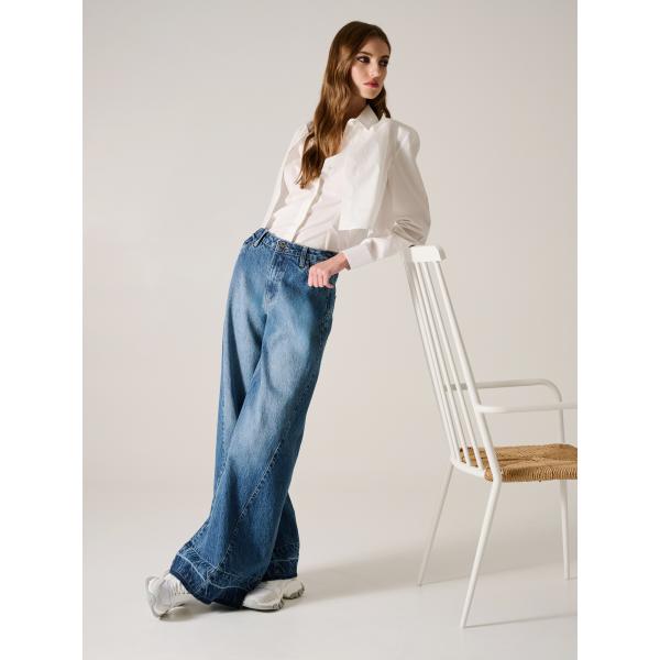 Jeans dritti da donna in azzurro con frange cinque tasche a vita alta in denim