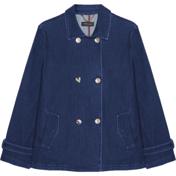 Trench da donna in denim a tinta unita, taglio corto e linea regular. Colletto a revers e chiusura doppiopetto con bottoni frontali. Maniche lunghe con cinturini al fondo per regolare lampiezza. Tasche anteriori a filetto per piccoli essenziali. Perfetta su maglietta e jeans per il giorno oppure sopra un abito midi per la sera, dona un touch trendy a look casual e urban.