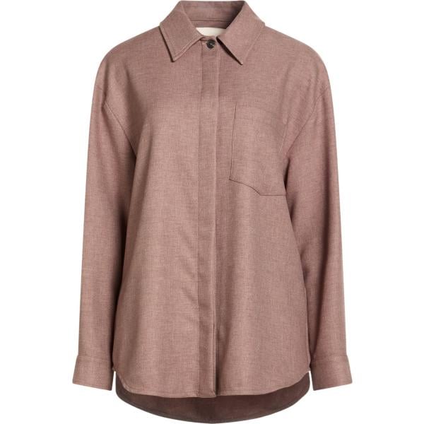 Blazer monopetto con tasche laterali colore fango. Stivaletti chelsea da donna in marrone scuro effetto scamosciato in pelle Frau. Pantaloni a palazzo da donna in marrone scuro a vita alta Dixie. Camicia Marrone a Righe con Fiocco color cioccolato. Shopping bag da donna in marrone scuro con stampe con zip in metallo Borbonese. Beanie da donna in beige sabbia Lauren.