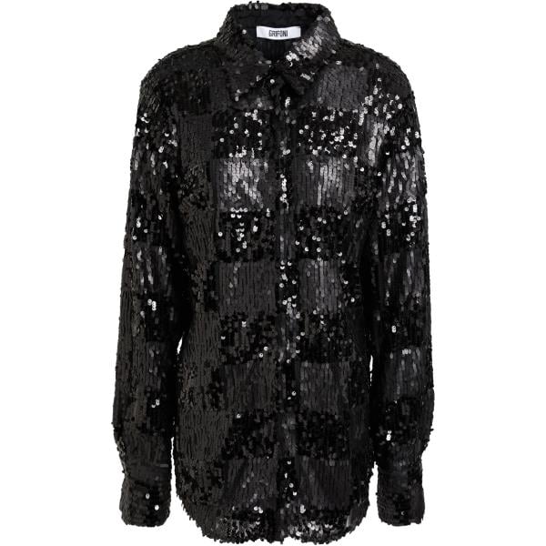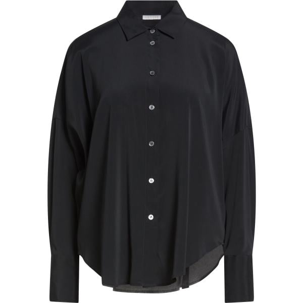 Borsa a spalla da donna mini in nero pece a calamita Michael Michael Kors, Giacca da donna in nero pece con cintura Please, Pantaloni a palazzo da donna in nero pece con paillettes con cintura Imperial, Camicia da donna in nero pece Rrl, Sneakers da donna in nero pece con tacco squadrato a punta tonda Rains.