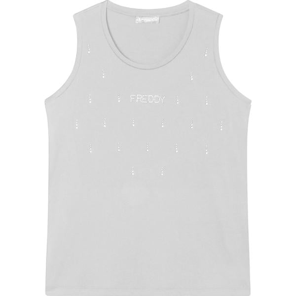 Questa canotta regular fit in jersey leggero è un must-have per il tuo guardaroba. La lunghezza regular si adatta a molteplici look mentre l’apertura laterale sul fondo permette di creare un nodo per uno stile più corto e fresco. Il design è completato da uno scollo tondo e spalline regular arricchiti dalla piccola stampa metallizzata FREDDY MOV al centro.
