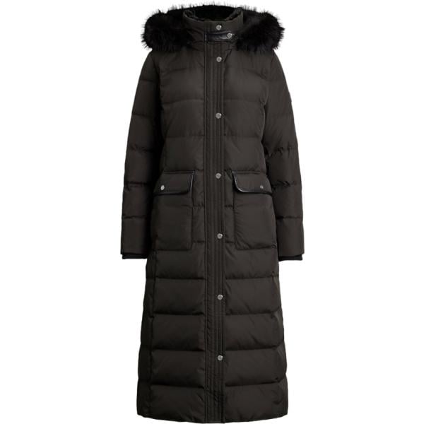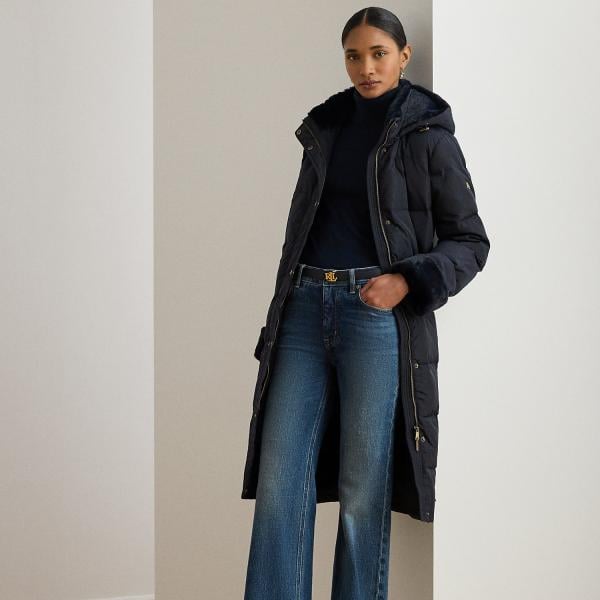 Borsa tote da donna in marrone scuro con zip in metallo Lauren, Maglione da donna in blu scuro collo a dolcevita in seta Lauren, Pantaloni da donna in blu scuro Lauren, Cintura da donna in marrone chiaro in pelle Lauren, Cappotto da donna in bianco avorio in lana Lauren, Mocassini da donna in blu scuro in pelle Lauren.