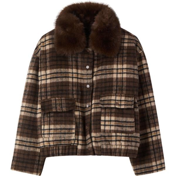 Pantaloni ampi con pinces a vita alta marrone cioccolato, chiusura con zip e bottone spostato. Maglione a coste verde prato, fit morbido, girocollo e maniche lunghe. Cappotto midi jacquard a quadri cioccolato/verde, monopetto, collo con revers, multi tasche. Stivaletti scamosciati verdone, cinturini decorativi, chiusura con zip, punta stretta, tacco geometrico alto. Accessori in tono.