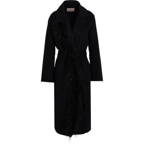 Stivaletti da donna in nero pece effetto scamosciato con tacco a punta tonda con zip Bianca Di, Gonna longuette da donna in nero pece a vita alta con zip Rinascimento, Camicia da donna in nero pece con fiocco intimo Rinascimento, Cappotto da donna lavorato a maglia girocollo monopetto a maniche lunghe con bottoni in lana Twinset.
