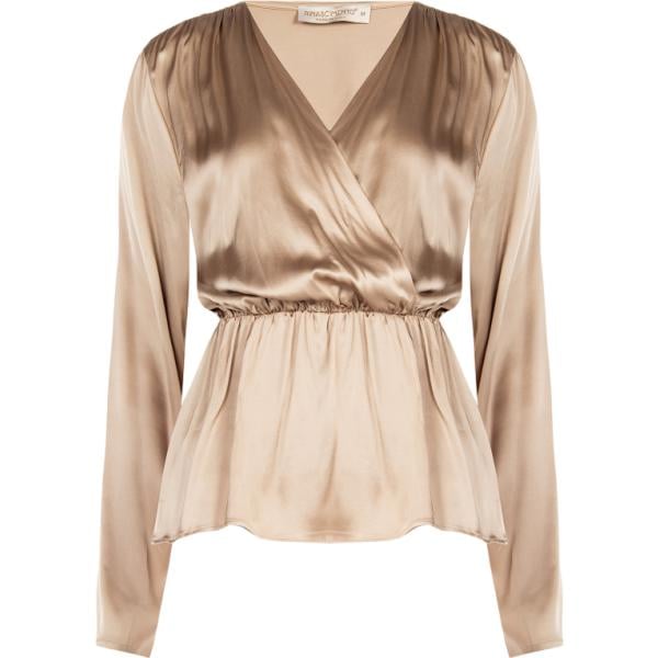 Blusa da donna in beige sabbia con ruches collo a v a maniche lunghe in viscosa