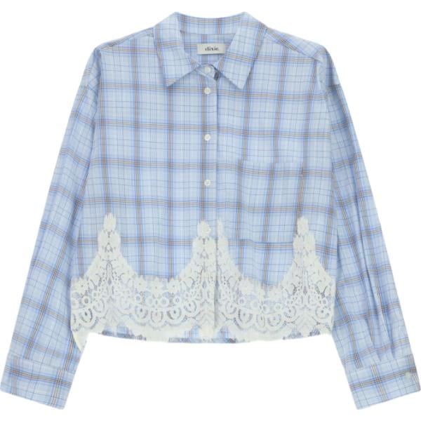 Camicia da donna in azzurro a fiori con pizzo collo classico corto a maniche lunghe con bottoni