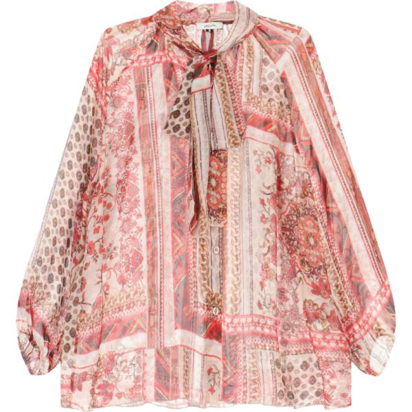 Camicia da donna in rosa chiaro con stampe con fiocco con scollo a maniche lunghe