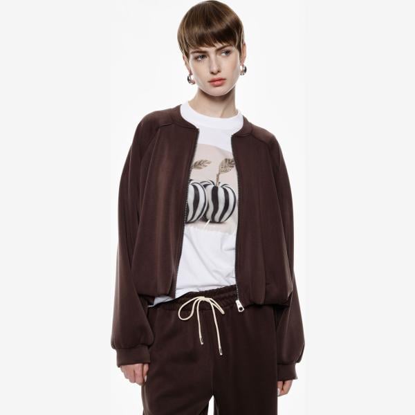 Felpa da donna in marrone scuro con stampe collo senza cappuccio a maniche lunghe con zip