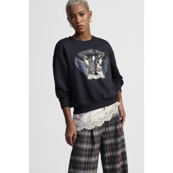 Felpa da donna in nero pece con stampe con strass girocollo con spacco a maniche lunghe in viscosa