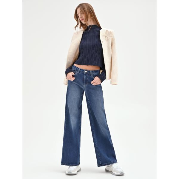 Jeans bootcut da donna in azzurro effetto delavè cinque tasche con zip in denim