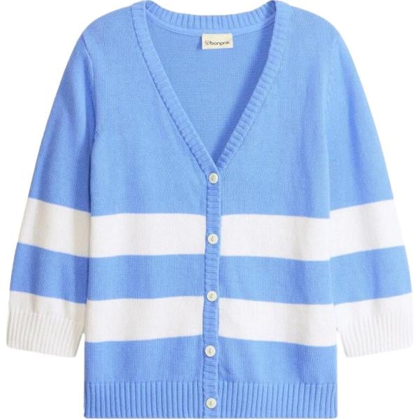 Cardigan da donna in azzurro a righe lavorato a maglia con scollo a maniche lunghe con bottoni