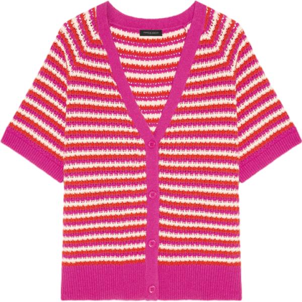Cardigan da donna in rosa scuro a righe collo a v a maniche corte con bottoni in cotone
