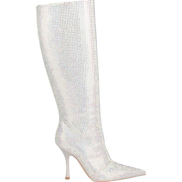 Stivali da donna in bianco neve con strass con tacco rocchetto a punta con zip in pelle
