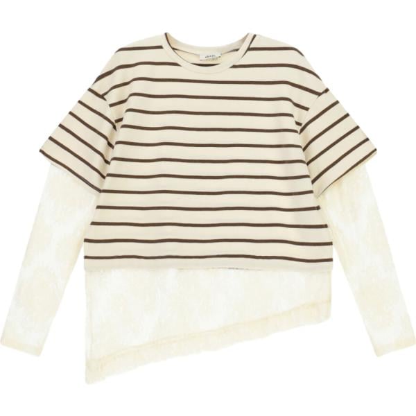 Top da donna forma asimmetrica in bianco avorio a righe con pizzo girocollo a maniche lunghe