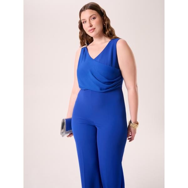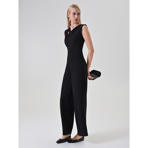 Tuta da donna con drappeggio in nero pece con scollo intimo con zip