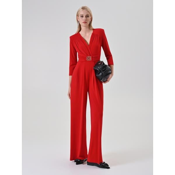 Tuta da donna con drappeggio in rosso classico con ruches con tacco con scollo con zip