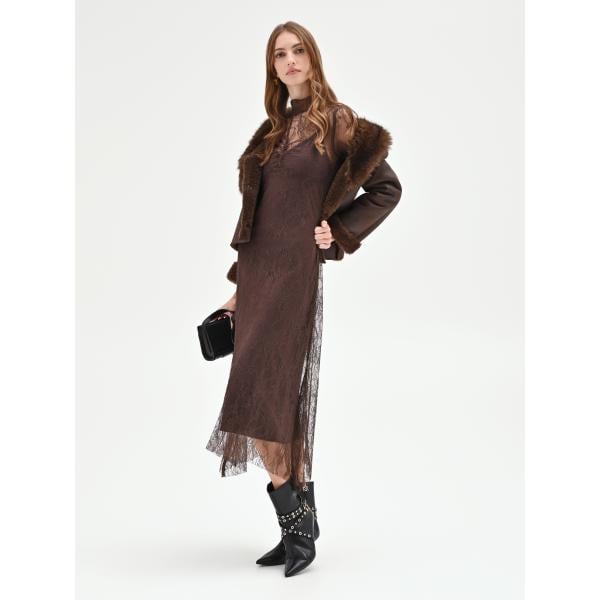 Vestito longuette/midi da donna in nero pece a fiori con pizzo collo alto a maniche lunghe