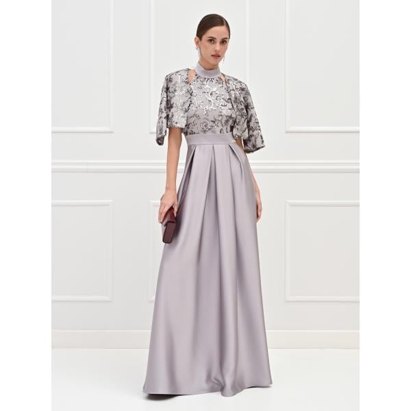 Vestito lungo da donna in grigio chiaro a fiori con paillettes con scollo lungo con zip