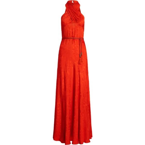 Vestito da donna in rosso classico a fiori con scollo con cintura