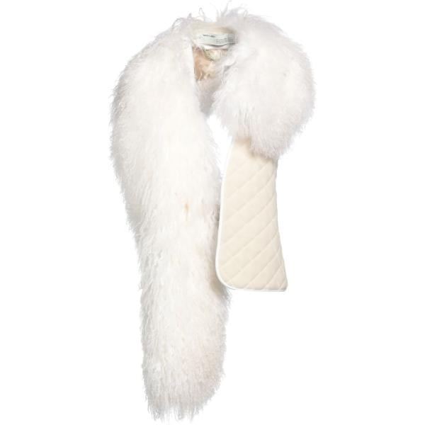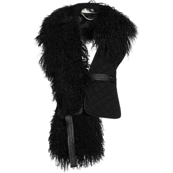 Pantalone in tessuto spalmato color nocciola, top in pizzo con colletto Perkins, ecopellicia con collo a scialle, accessori, clutch con profili in metallo dorato, décolleté effetto vernice, dettaglio in pietre gioiello, punta sfilata, cintura elastica con chiusura gioiello.