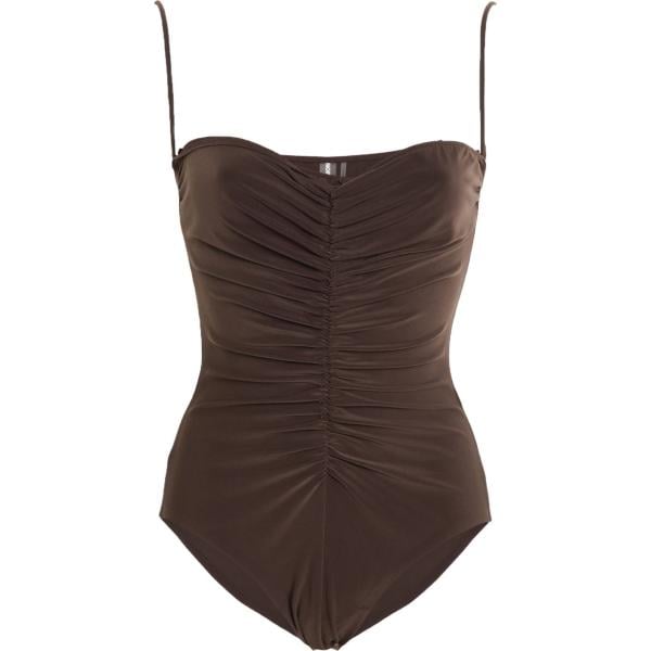 Pantaloni da donna in grigio scuro cropped con zip Loulou Studio, Giacca da donna in grigio scuro con cintura Imperial, Sandali in pelle da donna in bordeaux effetto scamosciato con tacco rocchetto a punta quadrata con lacci in pelle PHILOSOPHY di LORENZO SERAFINI, Borsa a secchiello da donna in bordeaux con bottoni in plastica Marni, Corpo da donna in marrone scuro collo classico a maniche lunghe con bottoni in cotone Imperial.