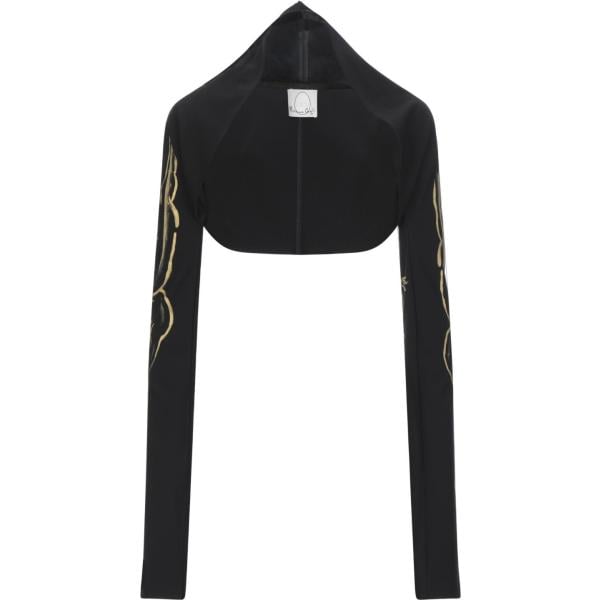 Pantaloni neri a palazzo, blusa nera con trasparenze in pizzo, giubbino nero con zip e cappuccio, stivaletti neri bassi con tacco basso, borsa a spalla nera in pelle, bracciale con applicazioni a forma di cuore.