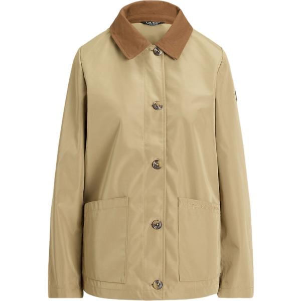 Giacca soprabito da donna in marrone chiaro a righe collo aperto tessuto impermeabile