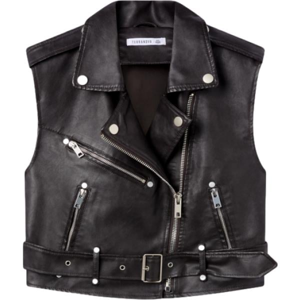 Giacca soprabito da donna forma asimmetrica in nero pece collo con revers senza maniche con zip in ecopelle