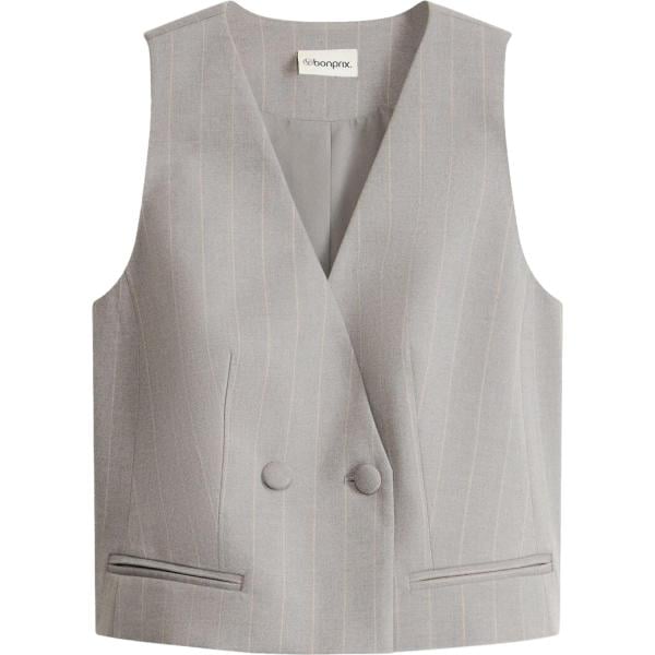 Gilet sartoriale con motivo a righe verticali, chiusura monopetto a tre bottoni rivestiti e rever classico. La silhouette strutturata valorizza ogni look contemporaneo, offrendo versatilità per combinazioni sofisticate e distintive. Tasche a filetto laterali completano il design per uno stile impeccabile.