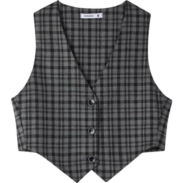 Minigonna da donna in bianco neve corto bonprix, Orecchini da donna in grigio chiaro bonprix, Stivali da donna in nero pece bonprix, Borsa a mano da donna in nero pece bonprix, Gilet da donna in grigio scuro bonprix, Maglione da donna in grigio chiaro con stampe a maniche lunghe bonprix.