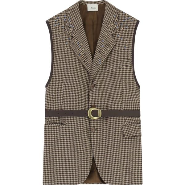 Gilet da donna in marrone scuro pied de poule con cintura